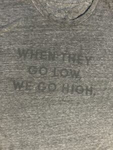 One practically threadbare shirt carries deep meaning for me. It bears MichelleObama’s words: “When they go low, we go high,” from the Becoming book tour I attended with a dear friend. That night felt like a gift—the wisdom Michelle Obama imparted, the joy of being in a room full of people who believed in better, and sharing the experience with someone I trust deeply.